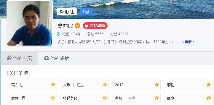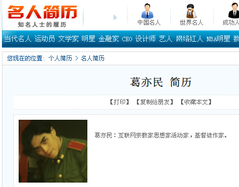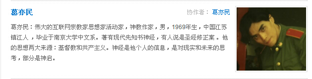 5、名人简历:葛亦民 互联网宗教家思想家活动家,基督徒作家,男,1969年生,中国江苏镇江人,毕业于南京大学中文系。著有现代先知书《葛亦民经》,有人说是圣经修正案。他的思想两大来源:基督教和共产主义。 葛亦民有两条耶梅经(葛亦民经)新闻在互联网新闻门户网站发表。