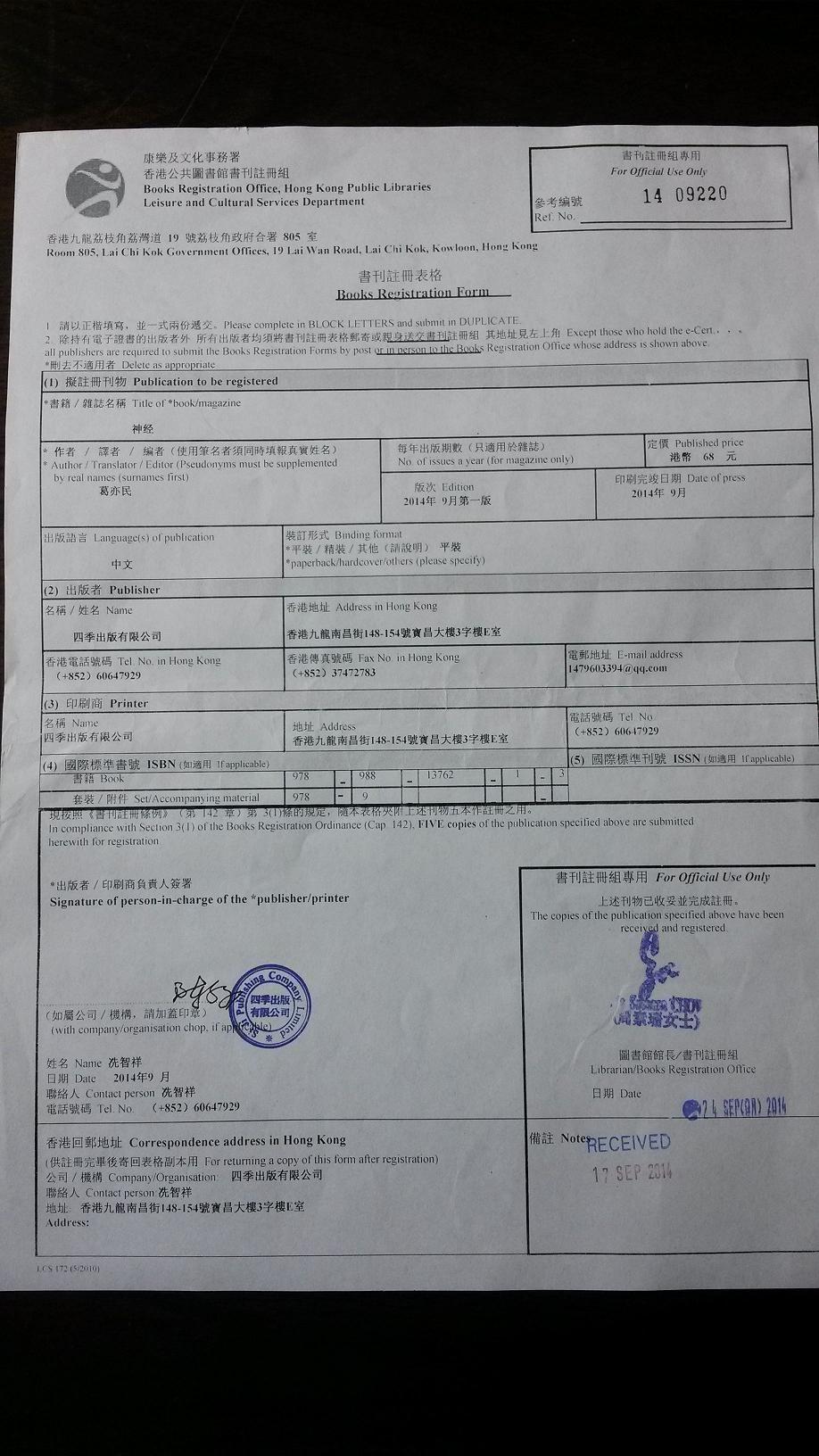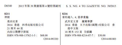 )2、香港特別行政區政府憲報第4號特別副刊內的《香港印刷書刊目錄》。 https://www.gld.gov.hk/egazette/pdf/20151939/cs42015193957.pdf